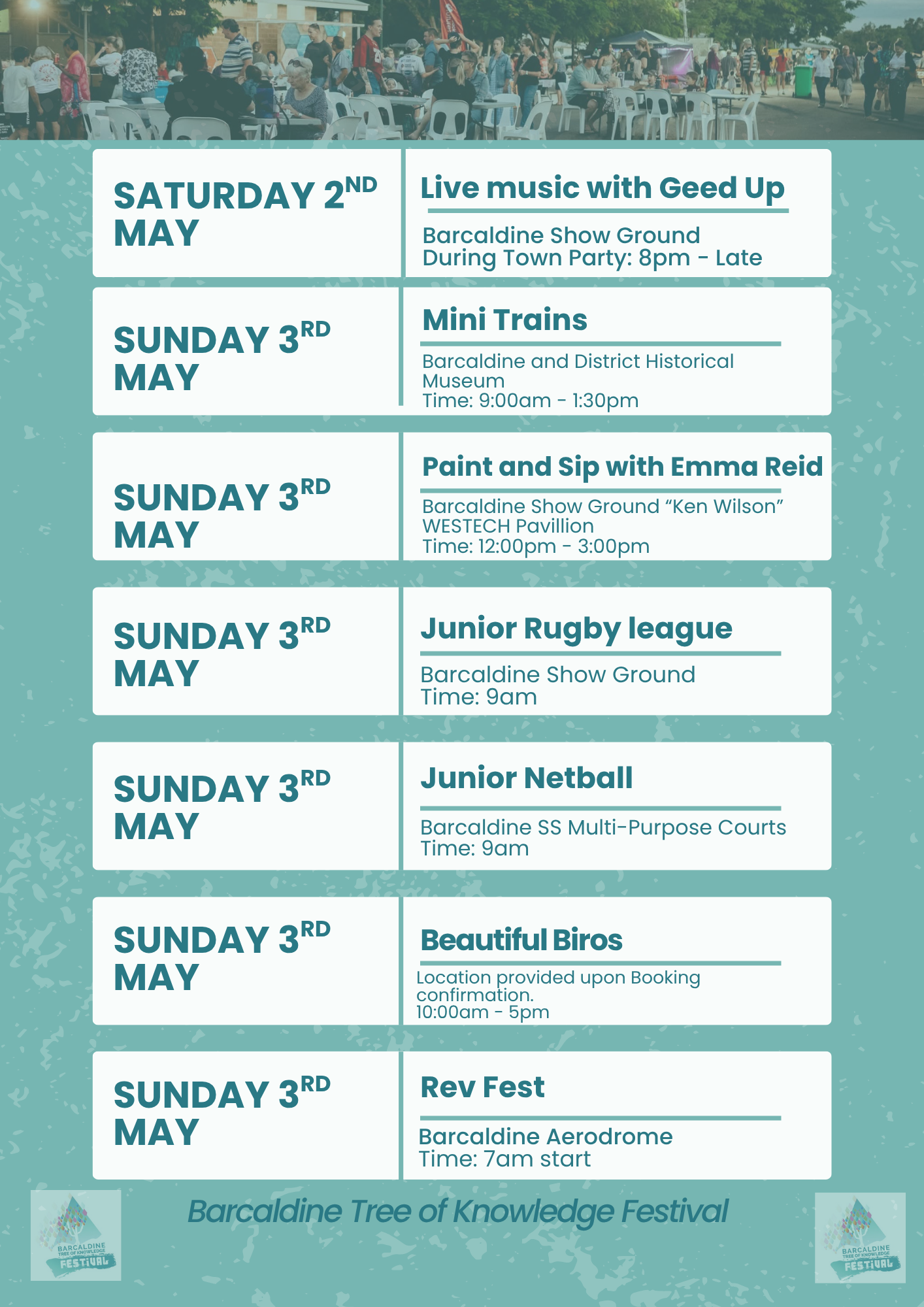 Our festival program is packed with a vibrant mix of community events, live entertainment, sport and family-friendly fun across the entire weekend. From the Friday night Street Party and Stockman’s Challenge, through to markets, races, live music and sporting events, there is something for everyone to enjoy. Be sure to explore the full schedule and plan your weekend so you don’t miss a moment of the Barcaldine Tree of Knowledge Festival celebrations.